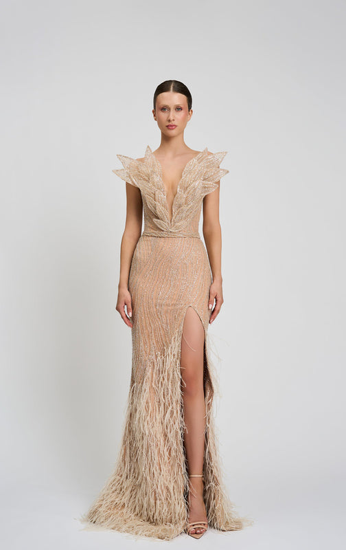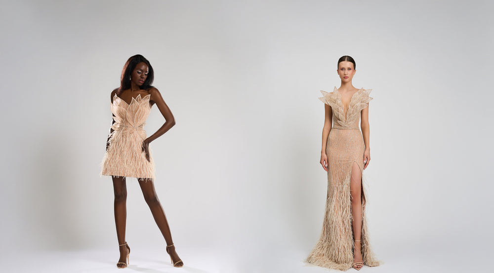 The essence of CRISTALLINI lies in our love for handcrafted haute couture details – delicate feathers, intricate embellishments, and sculpted 3D flowers, each element celebrating the artistry of timeless elegance.
